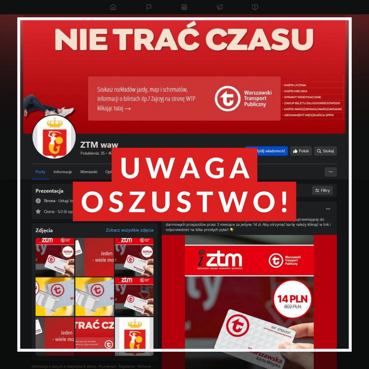 Warszawski Transport Publiczny (WTP) ostrzega: w mediach społecznościowych pojawił się fałszywy profil Zakładu Transportu Miejskiego (ZTM). Fałszywe konto oferuje zakup karty miejskiej w atrakcyjnej, promocyjnej cenie. To jednak kolejna próba oszustwa, na którą mieszkańcy i użytkownicy WTP nie powinni się nabierać.