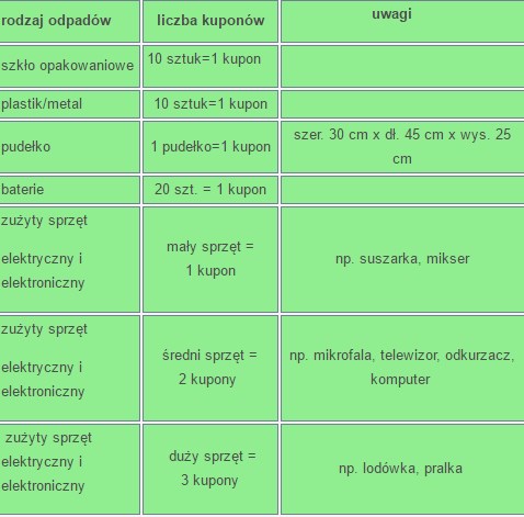 *Za kable kupony nie będą przyznawane. Niewymienione w Regulaminie odpady nie podlegają wymianie na kupony.