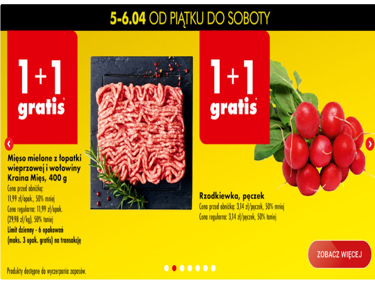 W ramach promocji, w dniach 5-6 kwietnia, przy zakupie mielonego mięsa z łopatki wieprzowej marki Kraina Mięs oraz pęczka rzodkiewki, drugie opakowanie tego samego produktu dostaniecie bez dodatkowych kosztów. Jest to idealny moment, by uzupełnić domową lodówkę w podstawowe produkty wysokiej jakości w jeszcze niższej cenie.
