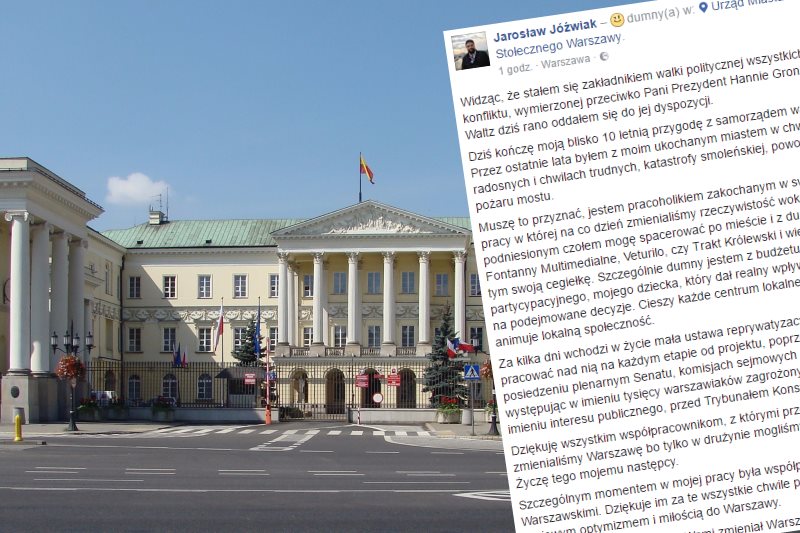„Odwołuje Jacka Wojciechowicza ze względu na słabe wyniki inwestycyjne. Przekazuje je do kompetencji Michała Olszewskiego” – mówiła Hanna Gronkiewicz-Waltz. Do dymisji podał się też Jarosław Jóźwiak. Jak twierdzi nie chce być więcej zakładnikiem walki politycznej wymierzonej przeciwko prezydent Warszawy, co ogłosił na swoim profilu na Facebooku. Obowiązki Jarosława Jóźwiaka przejmie Witold Pahl – radca prawny i były poseł Platformy Obywatelskiej. Od grudnia poprzedniego roku jest też członkiem Trybunału Stanu.
