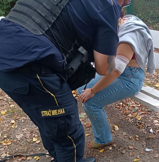 Strażnicy miejscy z Oddziału Specjalistycznego, patrolujący teren parku, zauważyli na jednej z ławek kobietę, która trzymała się za ramię, a obok niej niespokojnie kręcił się niewielki piesek. Kiedy funkcjonariusze podeszli bliżej, zauważyli obficie krwawiącą ranę na lewym ramieniu kobiety. Jak się okazało, rana powstała w wyniku ugryzienia przez psa, gdy kobieta próbowała rozdzielić dwa awanturujące się zwierzęta.