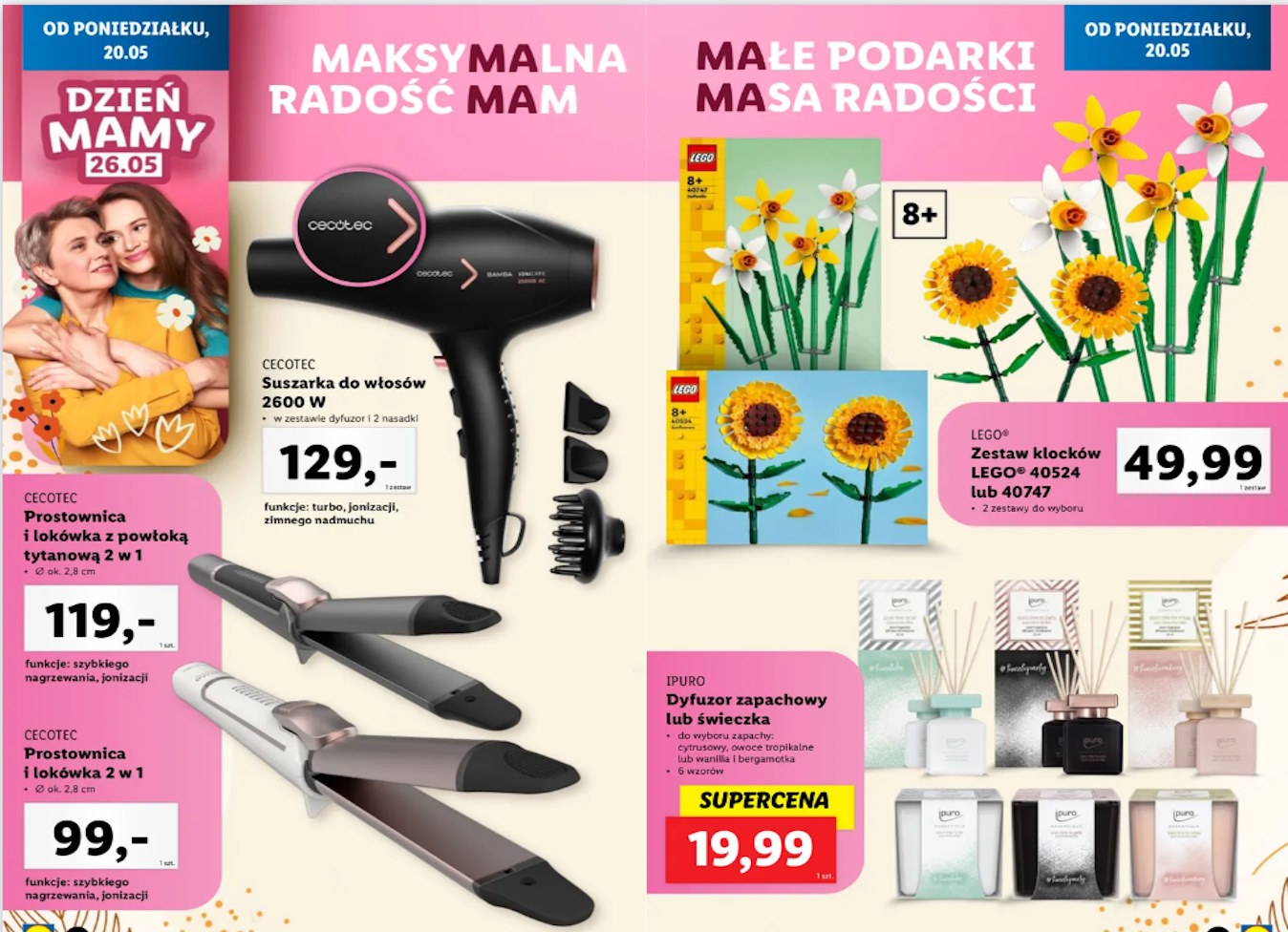 Odwiedź najbliższy sklep Lidl już od poniedziałku i skorzystaj z rewelacyjnych ofert na suszarki, prostownice, lokówki, zestawy LEGO oraz dyfuzory zapachowe i świeczki. Nie zwlekaj – takie promocje zdarzają się tylko raz w roku! Spraw, aby tegoroczny Dzień Matki był naprawdę niezapomniany.