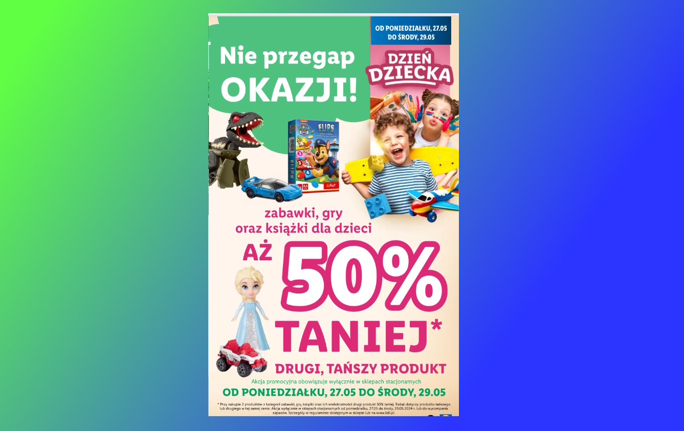 Akcja promocyjna obowiązuje wyłącznie w sklepach stacjonarnych Lidla, więc nie przegap tej wyjątkowej okazji, by przygotować się na Dzień Dziecka. Zapraszamy wszystkich rodziców i opiekunów do skorzystania z wyjątkowych zniżek, które Lidl przygotował specjalnie z myślą o najmłodszych i ich święcie.