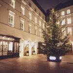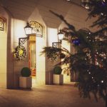 Udekorowano również sam budynek. W oknach zawieszono zielone wieńce ozdobione srebrnymi bombkami i ciepłym światłem lampek. Dekoracja ta bardzo dobrze komponuje się z oświetleniem podkreślającym architektoniczne elementy i detale budynku.