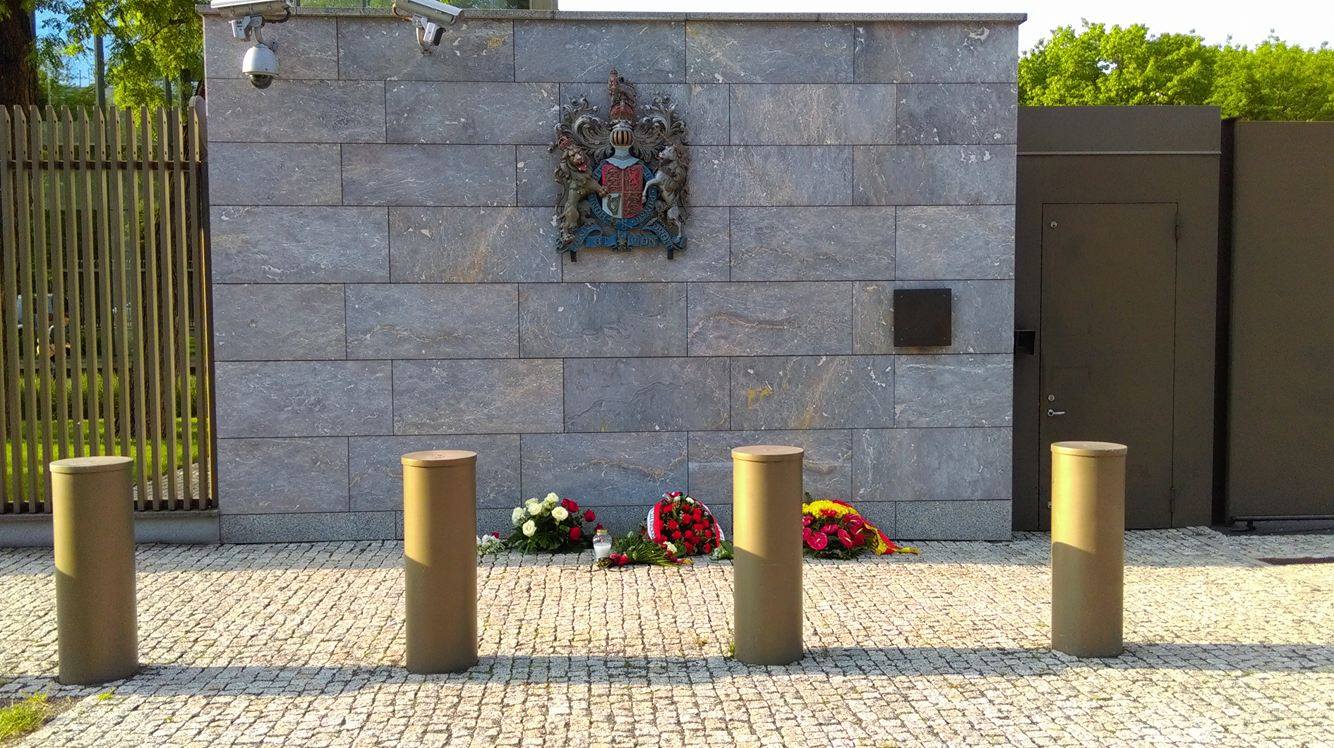Wieńce i kwiaty pod ambasadą Wielkiej Brytanii w Warszawie. Kondolencje i kwiaty złożyli Prezydent Andrzej Duda oraz Prezydent Warszawy Hanna Gronkiewicz-Waltz.