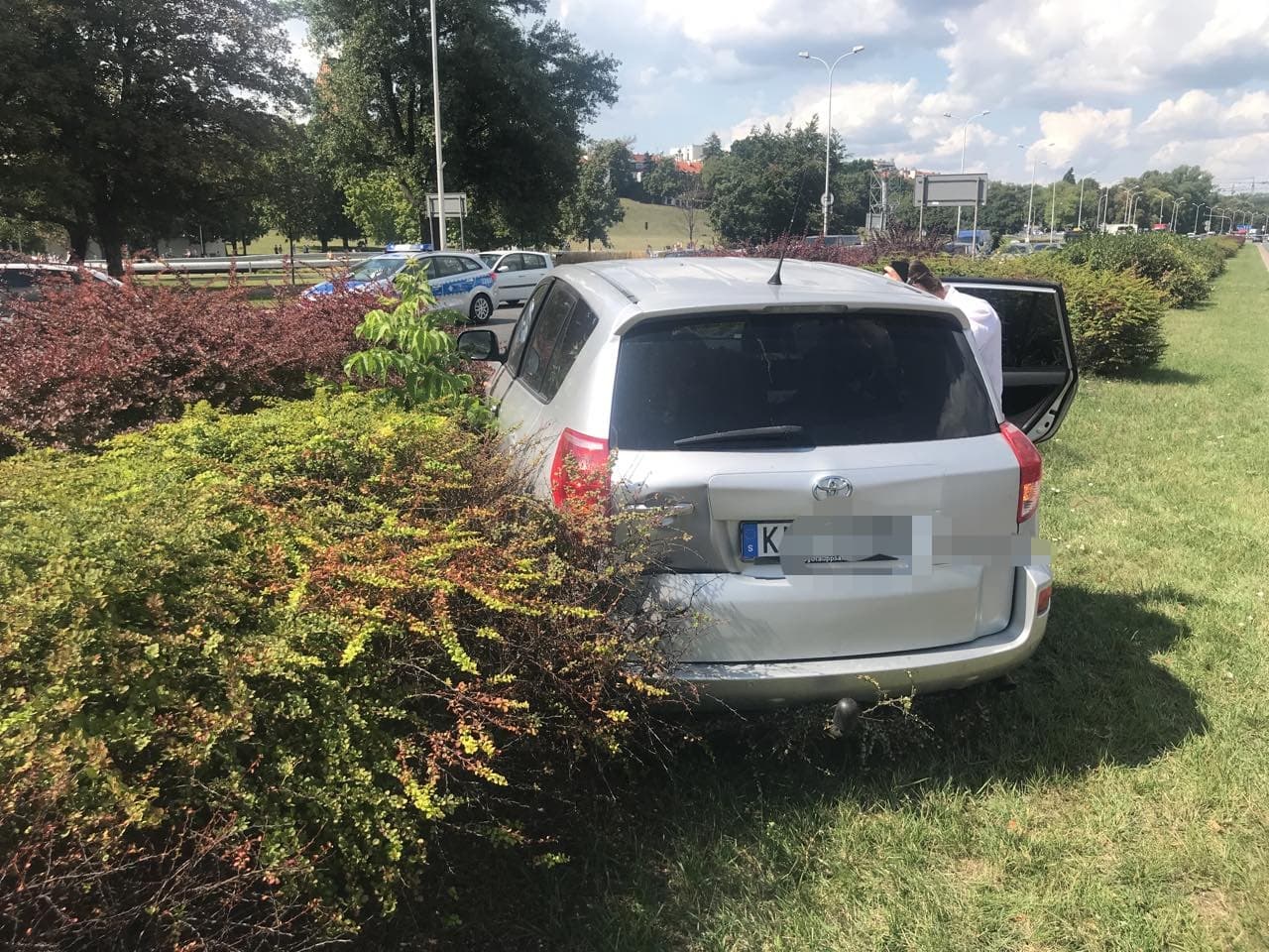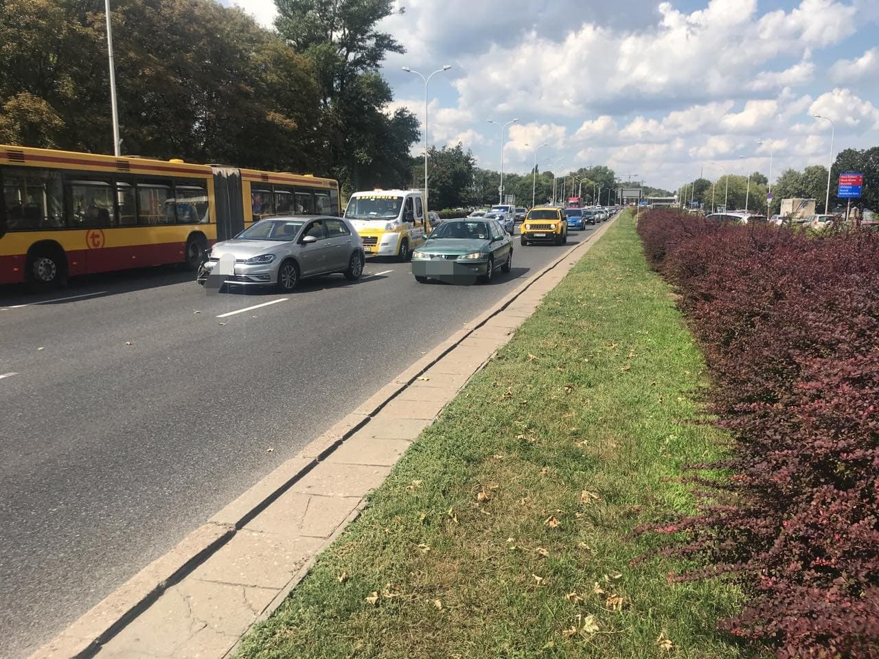 Na Wisłostradzie na wysokości Fontann doszło do zderzenia toyoty z volkswagenem. Auto na szwedzkich numerach zostało uderzone w tył przez volkswagena. Samochód wjechał w krzaki na pasie zieleni. Nikomu nic się nie stało.