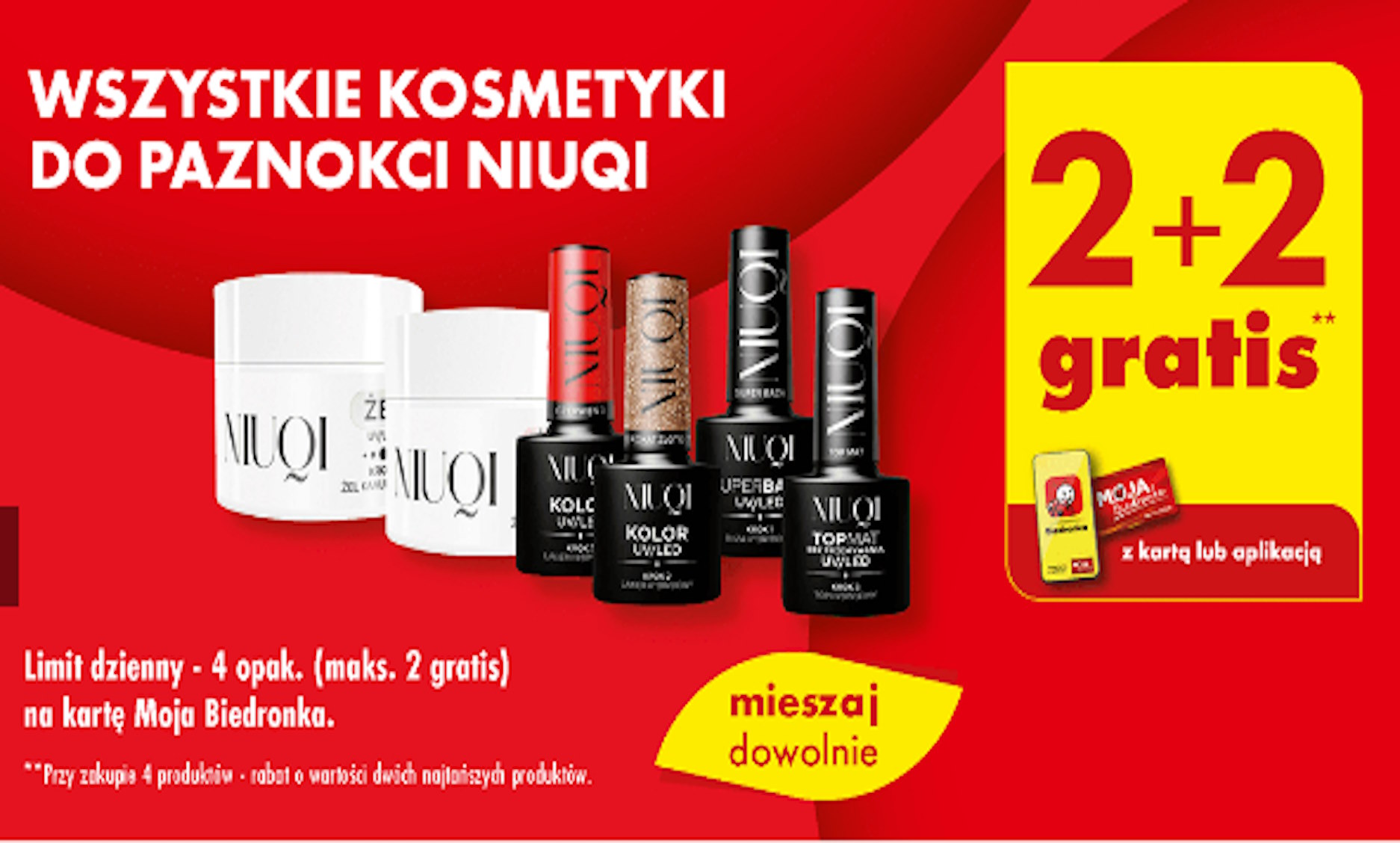 Przy zakupie czterech produktów z linii kosmetyków do paznokci Niuqi, dwa najtańsze otrzymuje się całkowicie za darmo. Dodatkowo, promocja ta umożliwia mieszanie produktów według własnych preferencji, co daje szansę na stworzenie spersonalizowanego zestawu do manicure i pedicure.