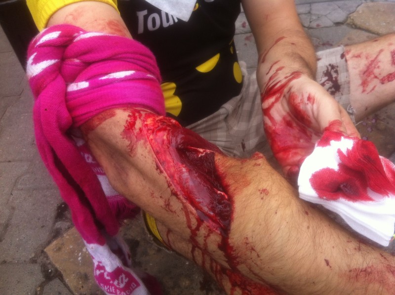 „Dziś na Tamka widziałem, jak samochód zajechał drogę rowerzyście pędzącemu w dół ścieżką rowerową. Rowerzysta uderzył w bok samochodu, rozbił szybę ręką, po czym fiknął przez dach samochodu i upadł na głowę na asfalt po drugiej stronie. Ręka została rozdarta i złamana. Kość wyszła przez skórę. Miał jeszcze inne obrażenia. Zatamowałem mu krwawienie szalikiem radiowej Trójki. Zadzwoniłem do jego żony. Był przytomny i dzielny. Stracił sporo krwi. Pogotowie zabrało go na Solec. Sprawca jak zwykle mówił, że nic nie widział i że nie chciał. Tam naprawdę jest niebezpiecznie” – czytamy w opisie zdarzenia na profilu Pana Rafała Betlejewskiego.