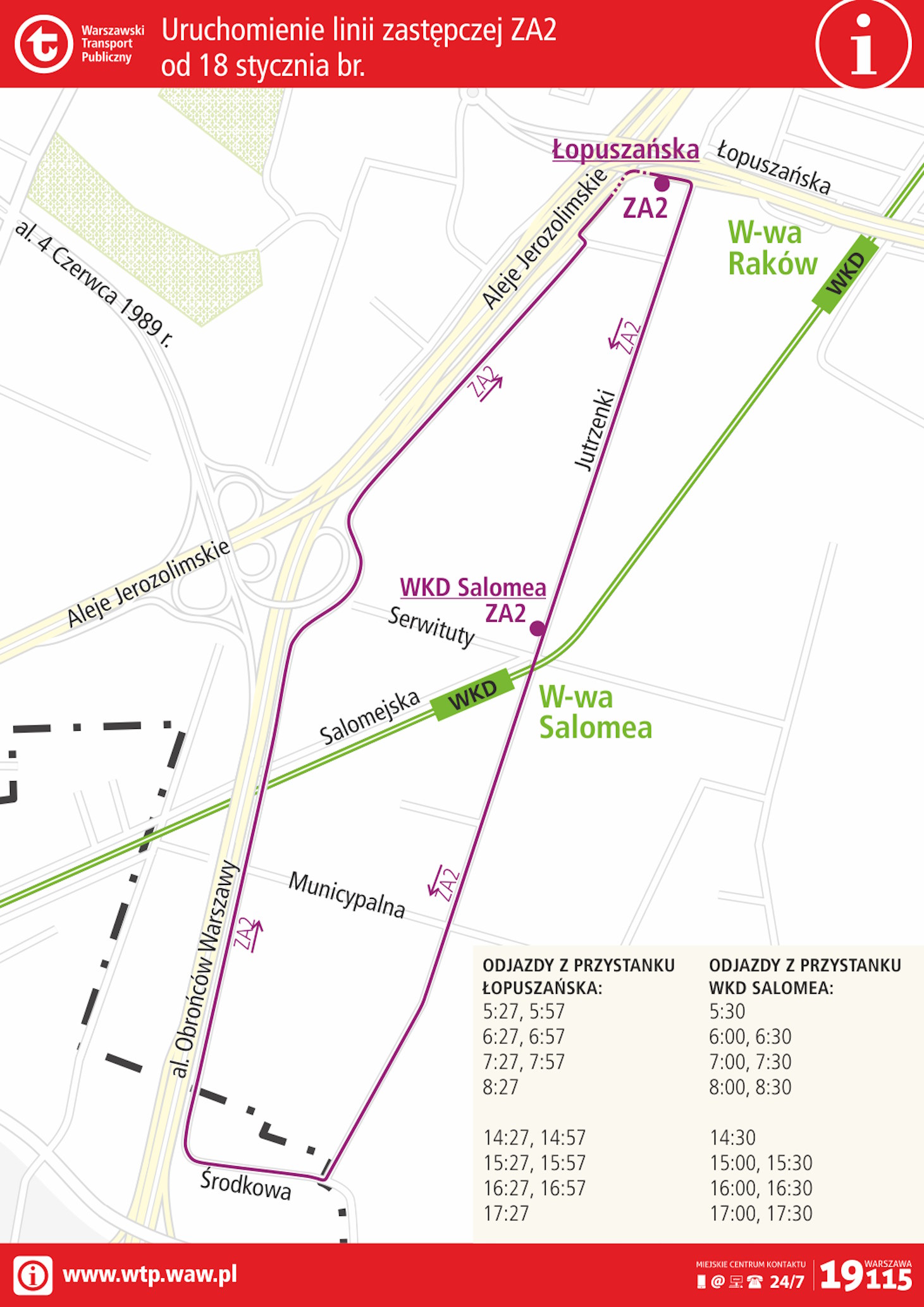 W odpowiedzi na utrudnienia, miasto uruchomi dodatkową zastępczą linię autobusową ZA2. Ma ona na celu ułatwienie dojazdu do i z okolic stacji Warszawa Salomea, umożliwiając pasażerom dostęp do pozostałych linii komunikacji miejskiej. Autobusy linii ZA2 będą kursować w rejonie przystanku Łopuszańska 03, zapewniając połączenie z autobusami linii 189 i 401, a także umożliwiając przesiadkę w Al. Jerozolimskich na przystanku Łopuszańska 01 na autobusy linii 187, 517 i 817.