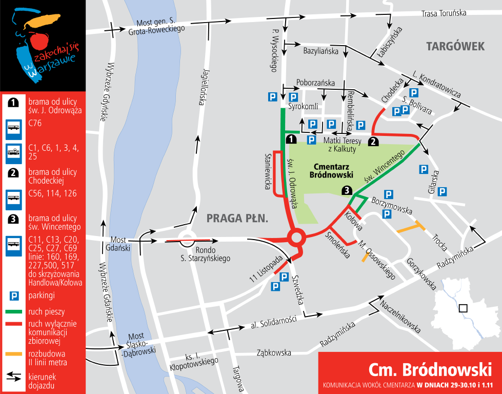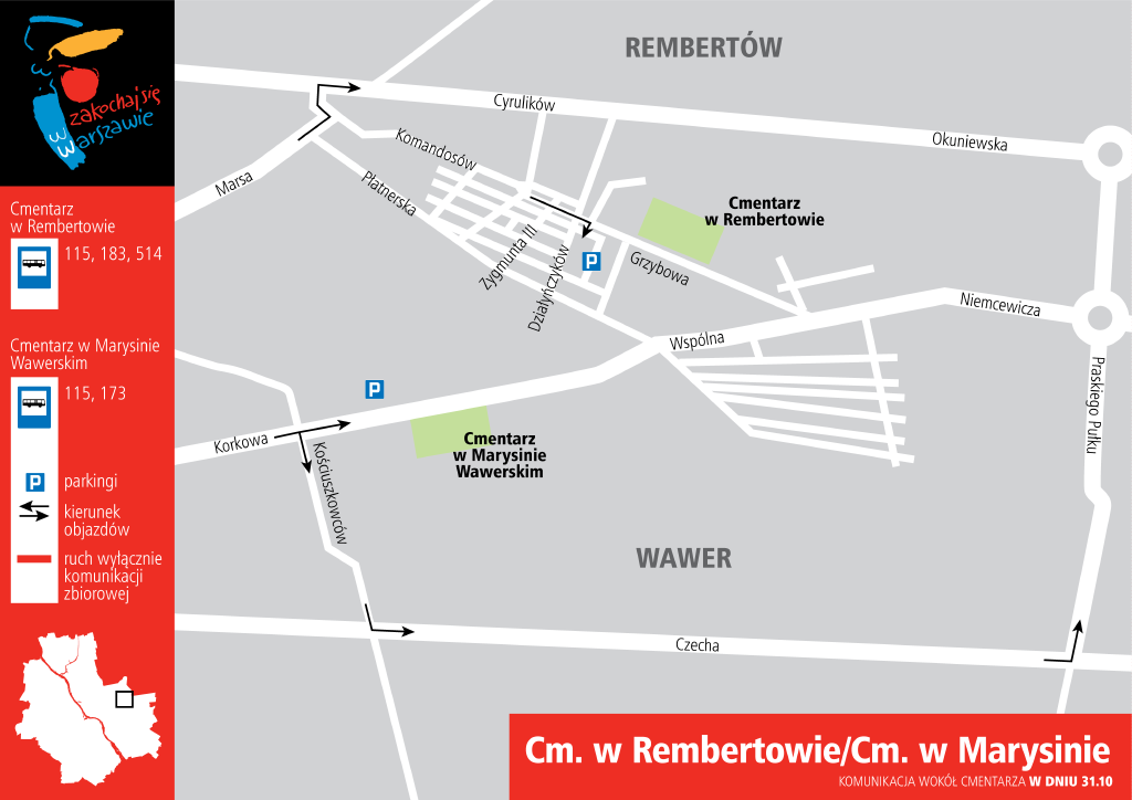Ponadto, w dniach 29–31 października i 1 listopada na ulicach: Elbląskiej, Z. Krasińskiego, J. Ostroroga, Tatarskiej, Duchnickiej i Przasnyskiej (od ul. Duchnickiej do ul. L Rydygiera) zostanie wprowadzony ruch jednokierunkowy.