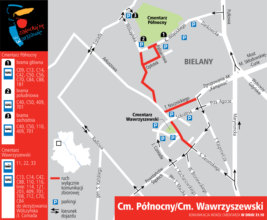 Ruch indywidualny w rejonie Cmentarza Północnego kierowany będzie ulicami Pułkową i K. Wóycickiego (jednokierunkową na odcinku Pułkowa – Żubrowa) do istniejących parkingów przy bramie Cmentarza, a dla zainteresowanych dojazdem do bramy południowej i zachodniej – dojazd odbywał się będzie ulicami Radiową i Estrady. Natomiast w rejon Cmentarza Wawrzyszewskiego ruch indywidualny kierowany będzie ulicami S. Żeromskiego, al. W. Reymonta i J. Conrada oraz ulicami J. Kasprowicza i Sokratesa do parkingów przy ulicach J. Conrada i Kwitnącej.