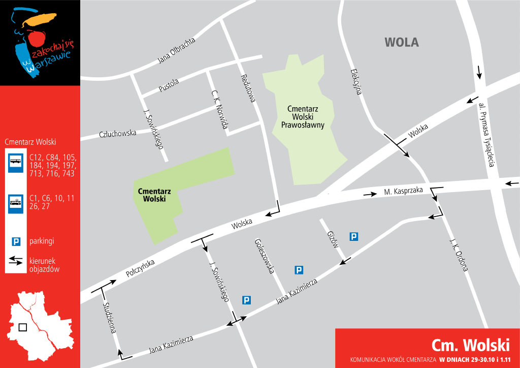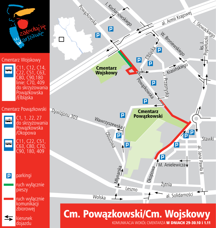 Ruch indywidualny kierowany będzie ulicami Wolską (lub Elekcyjną) i J.K. Ordona oraz Połczyńską i J. Sowińskiego do parkingów zlokalizowanych na ulicy Jana Kazimierza. Na ul. Wolskiej wzdłuż cmentarzy obowiązuje zakaz zatrzymywania się, a na ulicach Studziennej i J. Sowińskiego jeden kierunek ruchu.