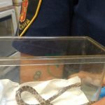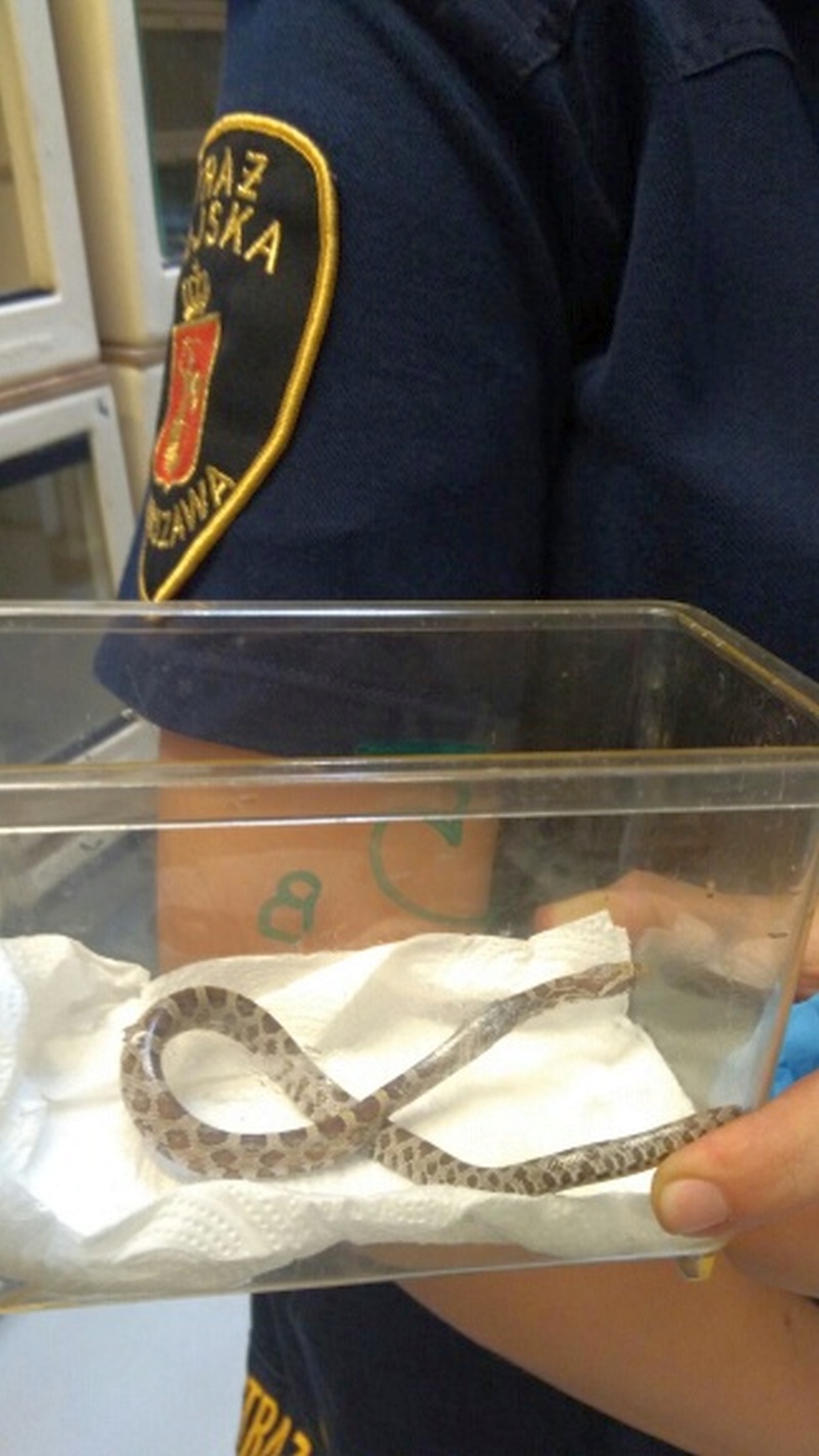 Strażniczka i strażnik po przybyciu na miejsce bezpiecznie odłowili gada, który na szczęście okazał się być młodym, niegroźnym wężem zbożowym.