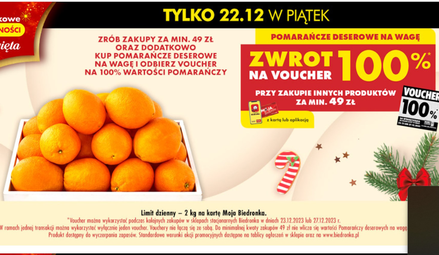 Biedronka, jedna z najpopularniejszych sieci supermarketów w Polsce, ogłosiła specjalną promocję świąteczną dostępną wyłącznie w ten piątek, 22 grudnia. Klienci mogą skorzystać z unikatowej oferty, która oferuje 100% zwrot wartości zakupionych pomarańczy deserowych w formie vouchera.
