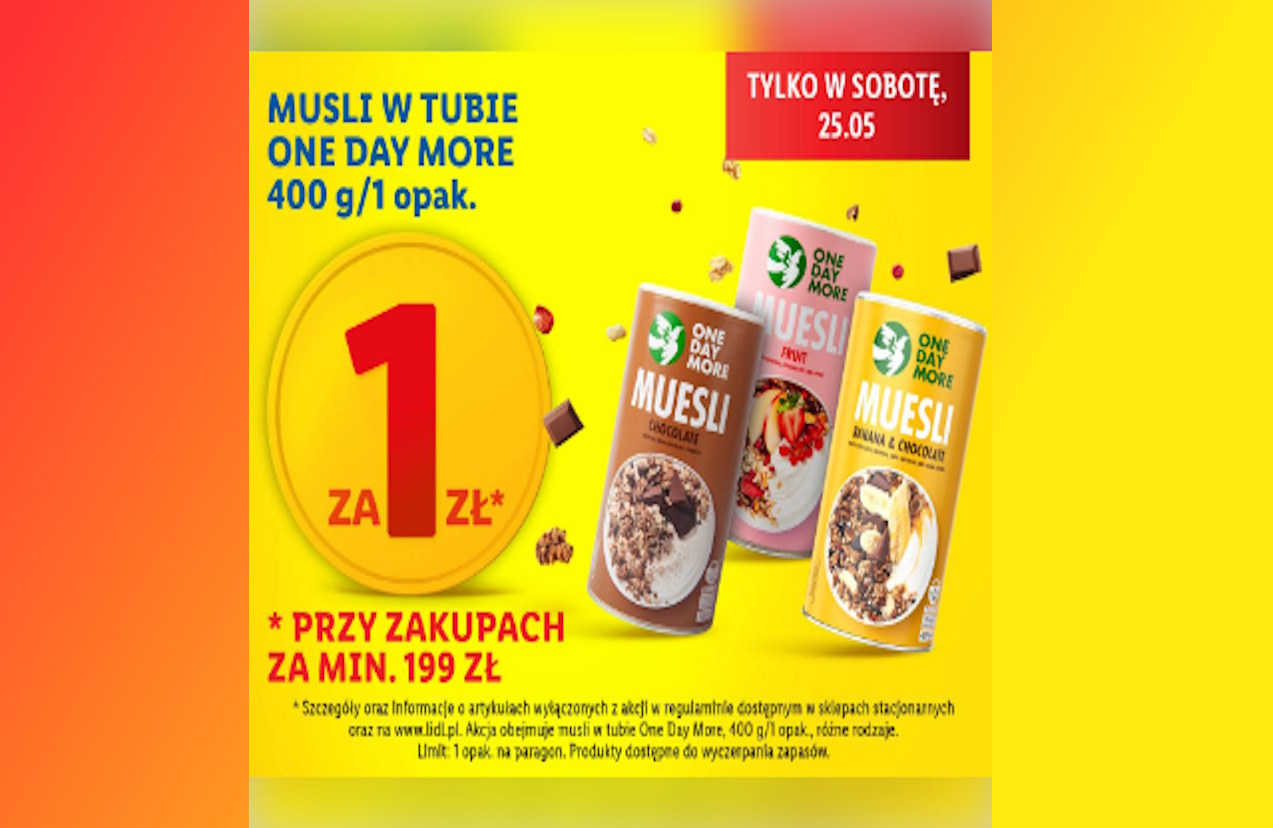Tylko w tę sobotę, 25 maja, Lidl zaprasza na niezwykłą promocję, w ramach której klienci będą mogli zakupić musli „One Day More” w cenie zaledwie 1 zł za opakowanie. To idealna okazja, aby zaopatrzyć się w smaczne i zdrowe śniadanie w wyjątkowo niskiej cenie.