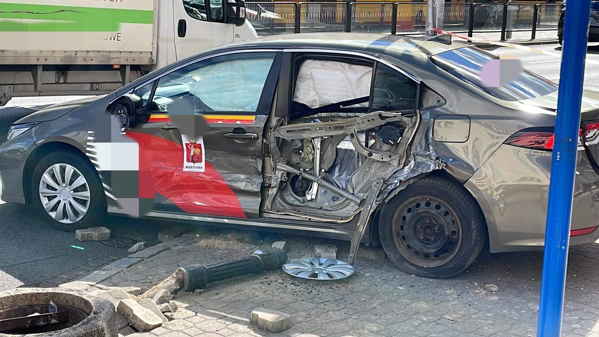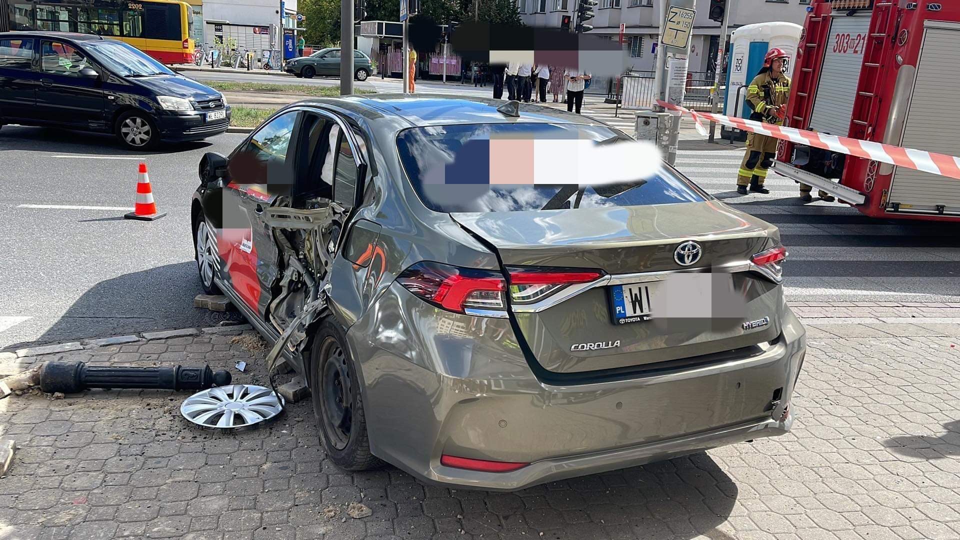 Po zderzeniu auto wjechało w słupki oraz latarnię.