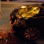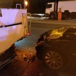 Samochód oczyszczania miasta ma rozbity cały tył, a BMW przód. Jeden pas jest zablokowany w stronę Pragi.