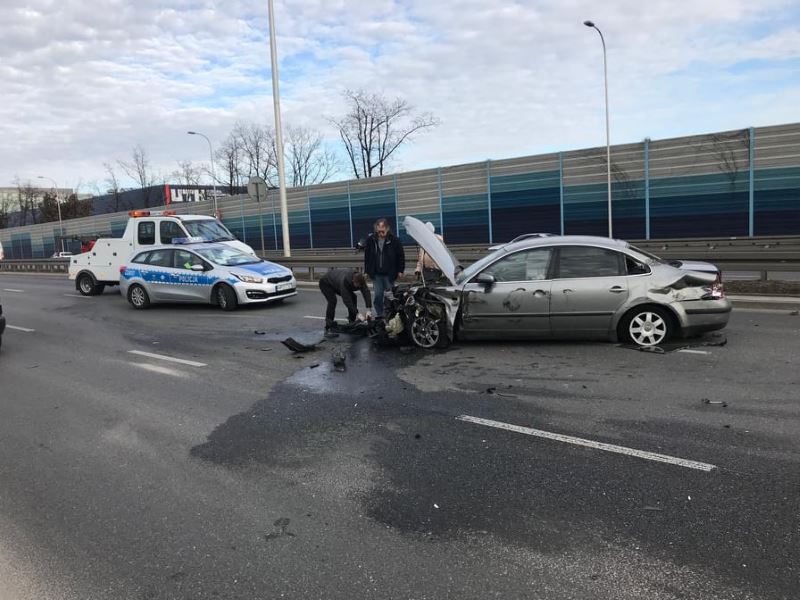 W zdarzeniu udział brały dwa samochody osobowe i ciężarówka. Jak informuje nasz obecny na miejscu reporter jeden z samochodów został całkowicie rozbity.