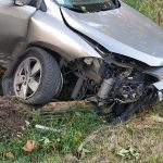 Samochodem jechał ojciec z synem. Po kolizjiz samochód osobowy marki renault odbił się, skosił słupek, zahaczył bokiem o betonowe zapory, na końcu złamał drzewo i wylądował w rowie.