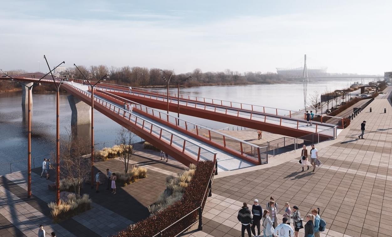 „Rozpoczęła się budowa mostu pieszo-rowerowego na Pragę. Wykonawca usunął ok. 40 drzew i zarośla z terenu placu budowy. Most połączy Bulwary Wiślane z Pragą na wysokości ulicy Karowej na lewym brzegu i Okrzei na prawym brzegu. Budowa potrwa ponad dwa lata” – informuje stołeczny ratusz.