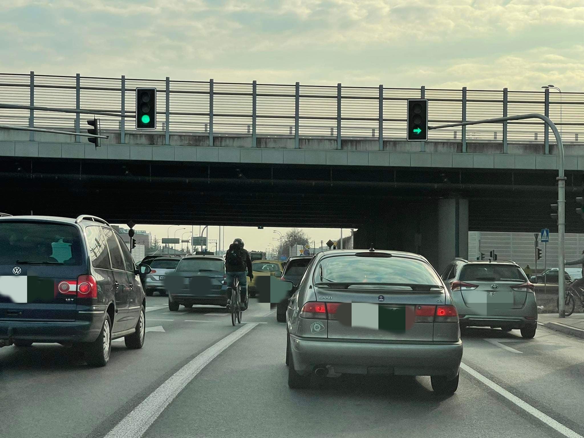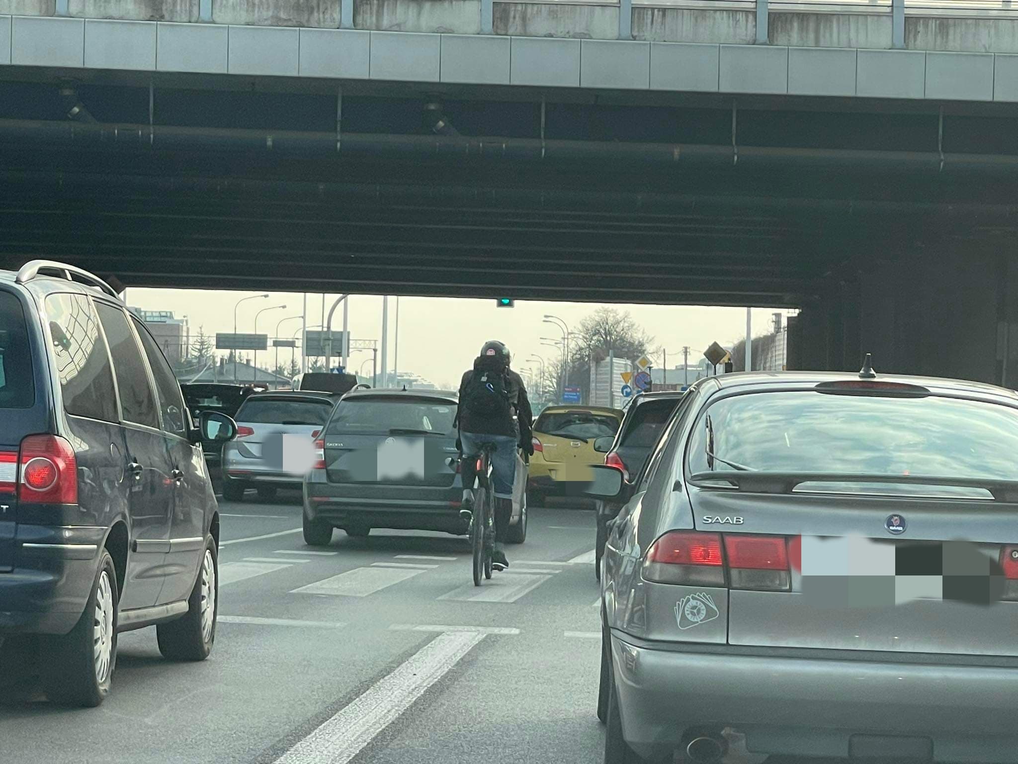 Zdjęcie Czytelnik wykonał na wysokości trasy S2. Jak mówi cyklista robił slalom po ulicy między autami w kierunku Janek. Doprowadzał do niebezpiecznych sytuacji.
