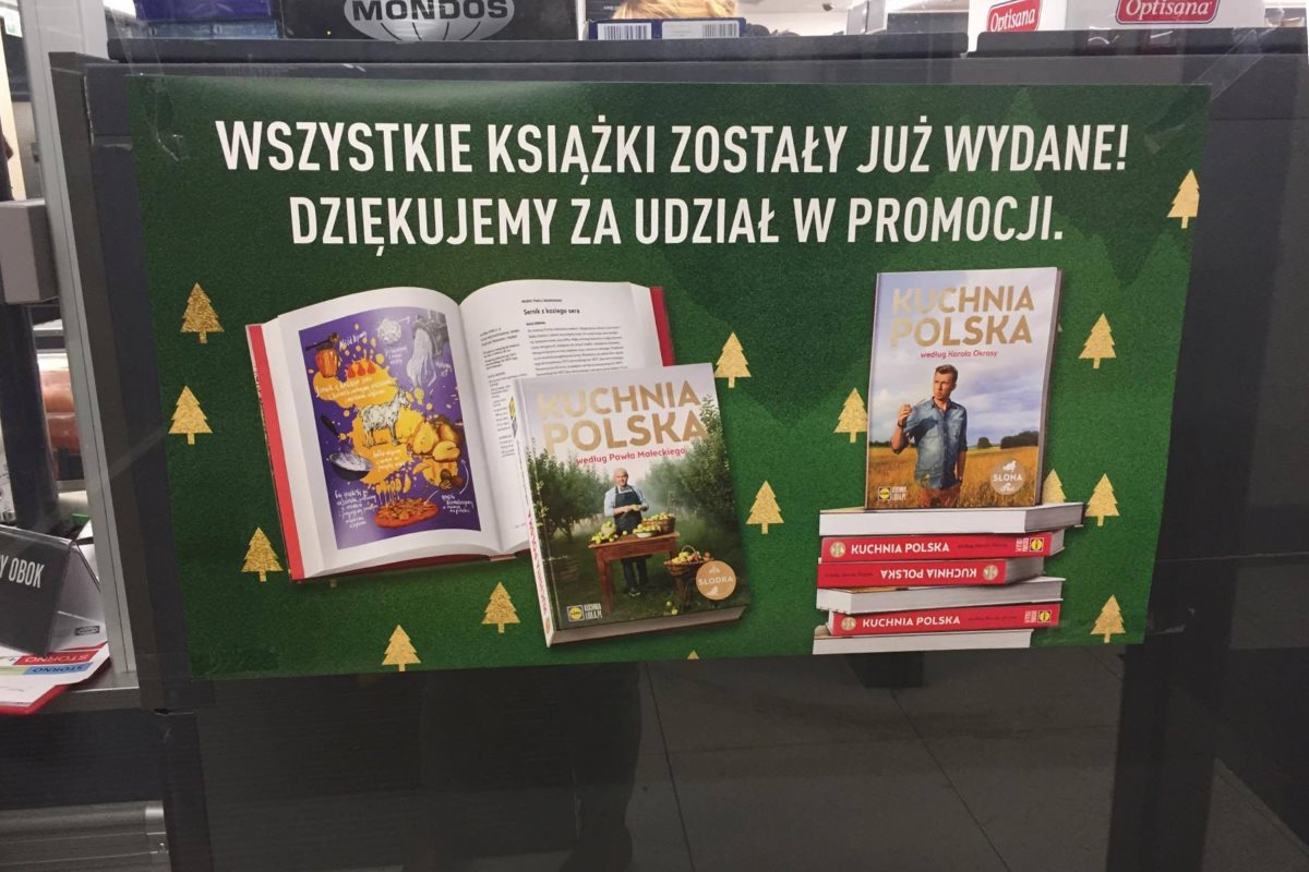 Przed Świętami Lidl wprowadził w swoich sklepach dodatkowe bonusy. Do zdobycia były dwie książki „Kuchnia polska według Karola Okrasy” – wersja słona i „Kuchnia polska według Pawła Małeckiego” – wersja słodka. Wystarczyło 6 razy zrobić zakupy za ponad 50 zł, dopłacić 1 grosz i książka trafiała w nasze ręce.