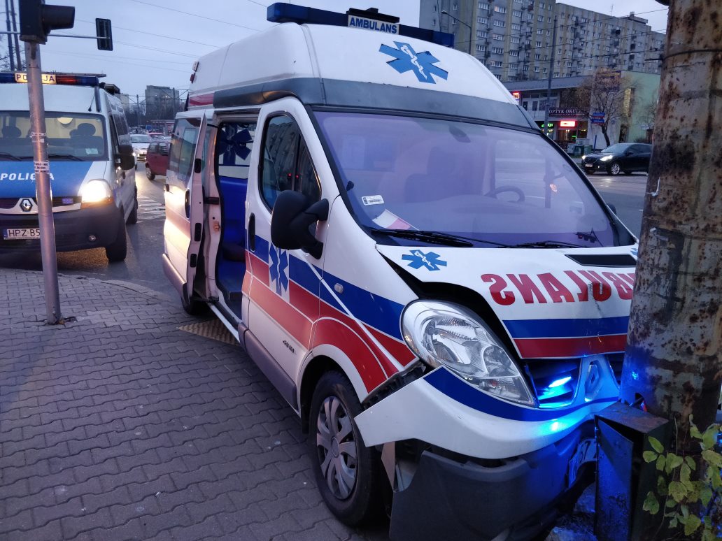 Na skrzyżowaniu ulic Broniewskiego i Jarzębskiego na warszawskich Bielanach doszło do zderzenia karetki z samochodem osobowym. Karetka po zderzeniu wjechała w latarnię.