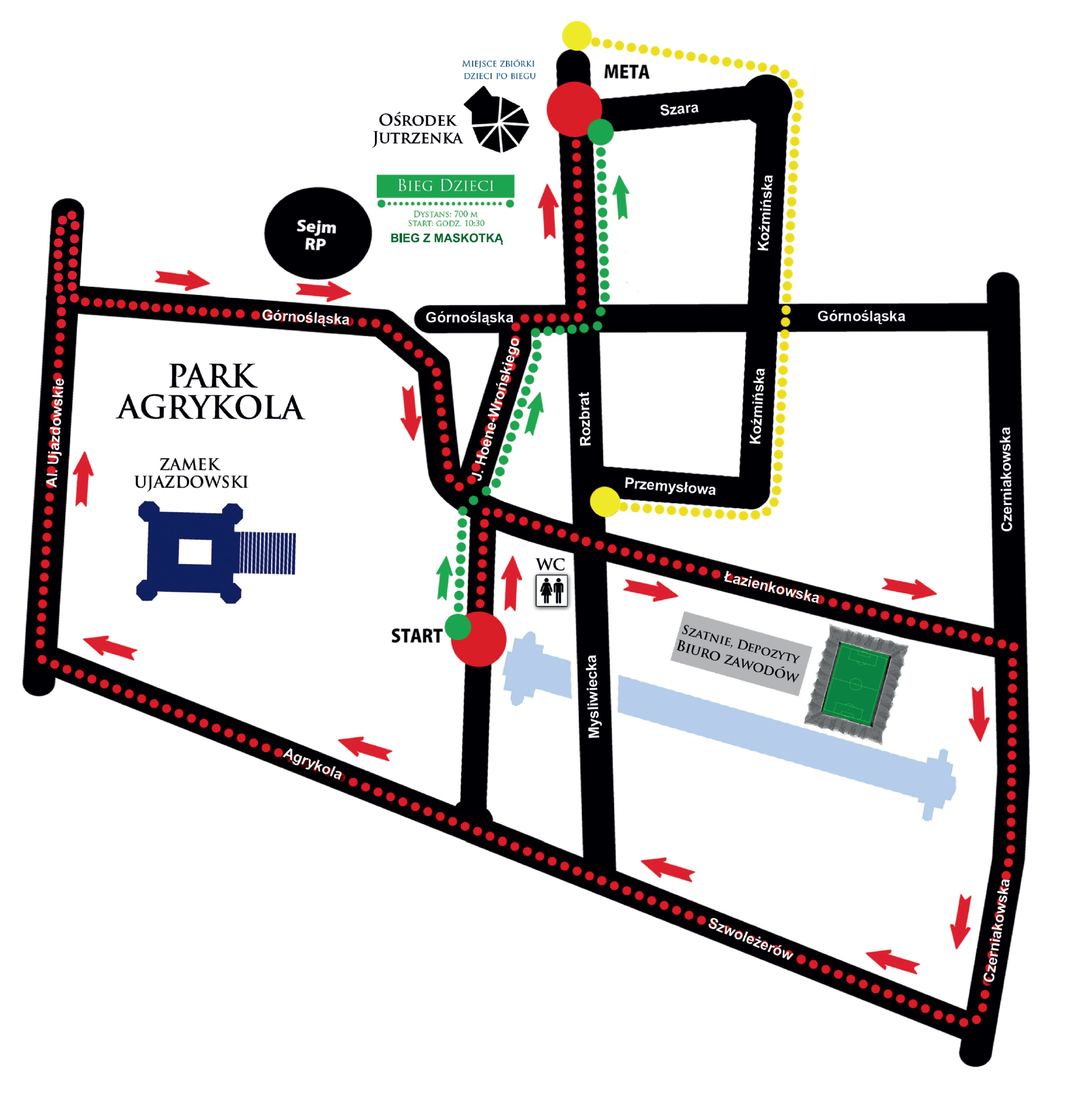 Uczestnicy biegu wystartują o godz. 11.00 z Parku Agrykola. Trasa biegu prowadzi ulicami: al. T. Hopfera, Łazienkowska, Czerniakowska, Szwoleżerów, Agrykola, Al. Ujazdowskie, Piękna, Górnośląska, Myśliwiecka, J. Hoene-Wrońskiego, Rozbrat. Zakończenie biegu planowane jest ok. godz. 13.00.
