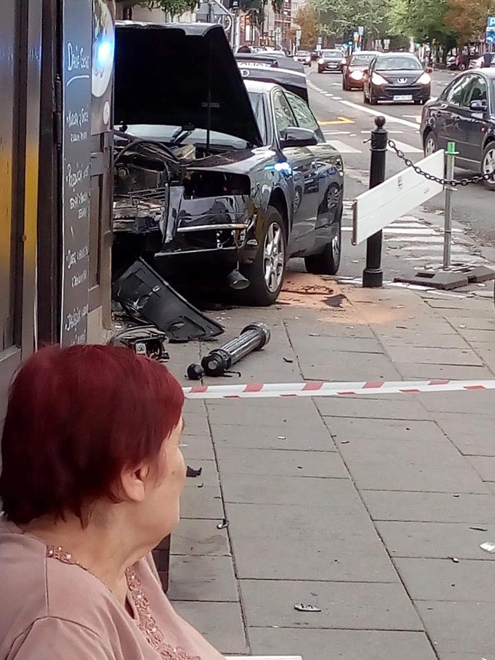 [AKTUALIZACJA] Nasz reporter jest na miejscu. Zniszczenia samochodu są bardzo poważne. Audi nie tylko zderzyło się ze ścianą budynku, ale też uderzyło wcześniej w słupek, całkowicie go wyrywając. Uszkodzenia toyoty przy tym nie są poważne. Widać, że audi uderzyło w bok toyoty od strony pasażera.