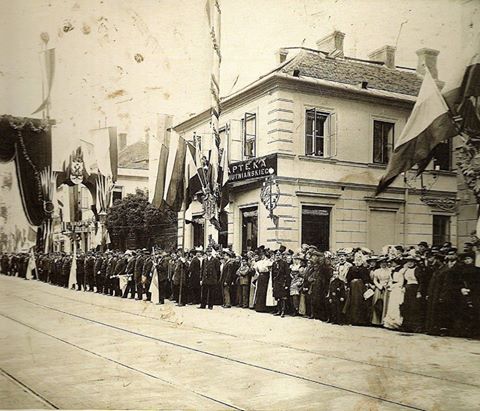 Na zdjęciu: warszawiacy oczekujący na wjazd Mikołaja II przed Apteką Mutniańskiego (1 września 1897).”