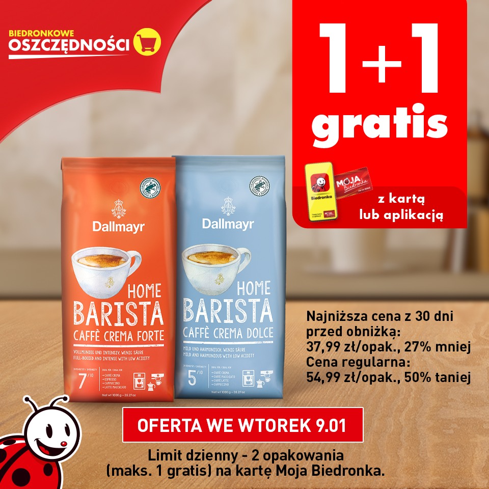 Na pierwszy ogień idzie propozycja dla koneserów kawy. Biedronka proponuje dwa rodzaje kawy z serii Dallmayr Barista: „Caffe Crema Forte” oraz „Caffe Crema Dolce”. Są to specjały, które można przyrządzić we własnym zaciszu, nie odbiegające jakością od tego, co serwują profesjonalne kawiarnie. Atrakcyjność oferty podkreśla promocja „1+1 gratis”, która pozwala na uzyskanie drugiej paczki kawy bez dodatkowych kosztów. To okazja, by zaopatrzyć się w aromatyczne zapasy na dłużej.
