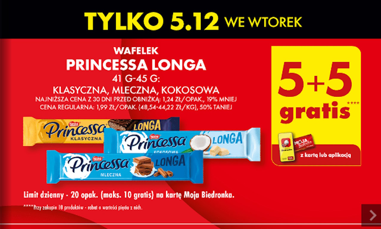 W najbliższy wtorek, 5 grudnia, klienci sieci supermarketów Biedronka będą mogli skorzystać z wyjątkowej oferty. W ramach jednodniowej promocji, przy zakupie pięciu wafelków Princessa Longa, każdy kupujący otrzyma pięć dodatkowych sztuk gratis. Oferta dotyczy dwóch wariantów smakowych: klasycznego i kokosowego.