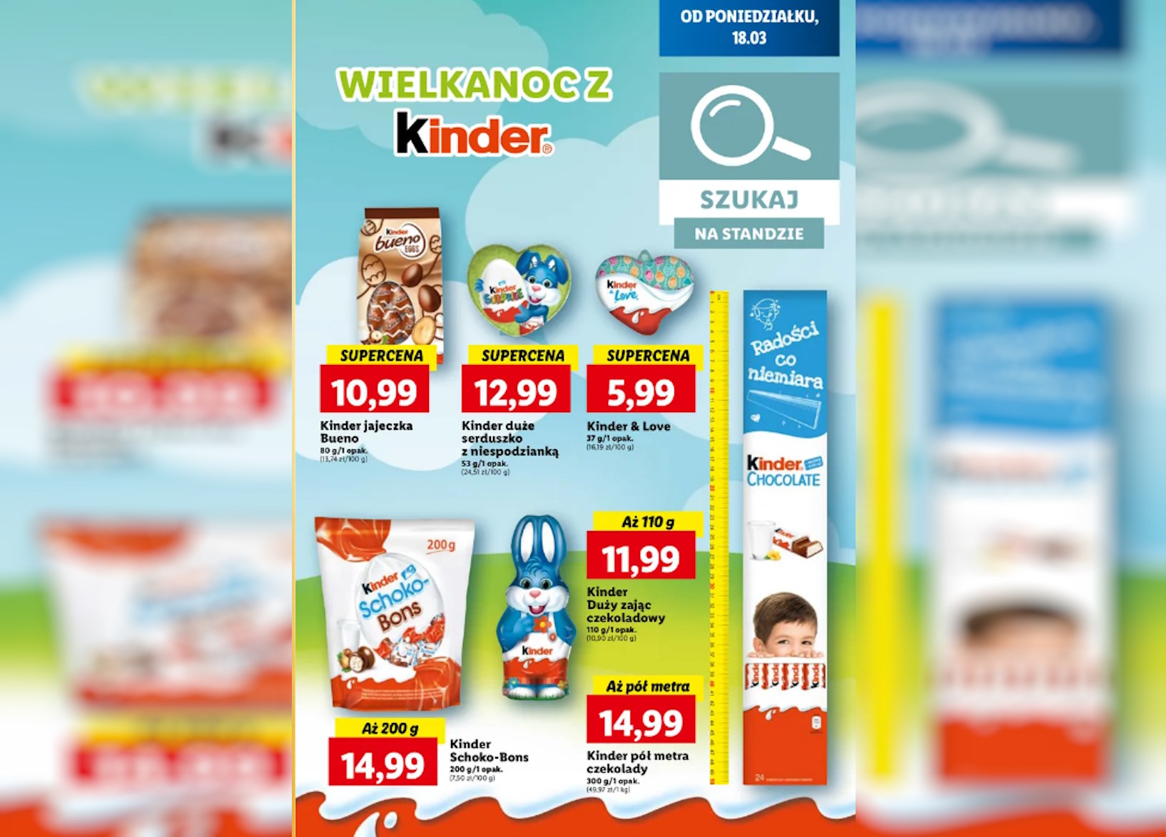 - Pół metra czekolady Kinder w cenie 14,99 zł – bo któż nie kocha tych małych, kremowych tabliczek?