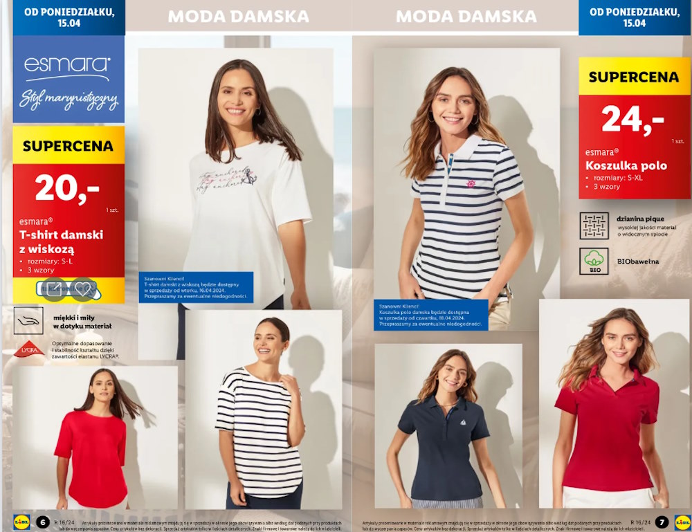 W ofercie znajdziemy m.in. t-shirty damskie z wiskozy w cenie 20 zł za sztukę, które dostępne są w trzech wzorach oraz rozmiarach od S do L. Komfortowe i przewiewne, będą idealnym wyborem na ciepłe, wiosenne dni. Miękki i przyjemny w dotyku materiał z dodatkiem elastanu LYCRA® gwarantuje wygodę i świetne dopasowanie do sylwetki.
