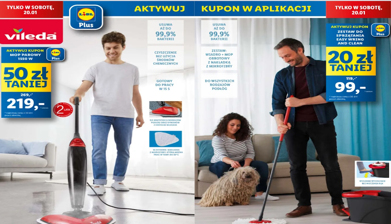 Promocja dotyczy wyłącznie soboty, 20 stycznia, więc warto już teraz zaplanować sobotnie zakupy w Lidlu i skorzystać z okazji, które pozwolą nie tylko zadbać o czystość, ale również o domowy budżet. To także dobry czas, aby zainwestować w produkty, które będą służyć przez długie lata – mop parowy Vileda objęty jest bowiem dwuletnią gwarancją, co świadczy o jego wysokiej jakości.