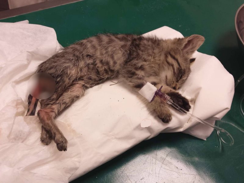 Pan mówi – 'proszę uśpić, proszę mu pomóc, niech się nie męczy’. Kocię się pręży, oddycha – czasami, serce ledwo ledwo, ’Pan zostawi; spróbuje złapać resztę nim będzie to samo, może choć jednym byście się zajęli, może ktoś weźmie. Ok, proszę zostawić, niech się nie męczy’. Po 2 godzinach kocina nadal żyje, zaczyna się ruszać, próbuje pić pojona ze strzykawki.. Pomóżcie – ona, bo to ONA chce żyć, nie wiem które to życie już przez nią wykorzystane , ale tak bardzo chce żyć, .sama nie dam rady – ja tu tylko pracuję, tlen, inkubator, leki, podkłady, karma, Proszę…” – pisze weterynarz.