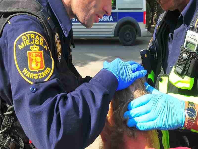 Strażnicy z VI Oddziału Terenowego tuż przed godziną siódmą otrzymali wezwanie na przystanek św. Wincentego-Żuromińska, gdzie miał znajdować się ranny w głowę człowiek. Kiedy po chwili dotarli na miejsce, zastali siedzącego mężczyznę z rozbitą głową. Poszkodowany spał. Strażnicy w ramach pomocy przedmedycznej opatrzyli krwawiący łuk brwiowy.