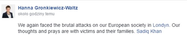 Hanna Gronkiewicz-Waltz, Prezydent Warszawy w odpowiedzi na zamach terrorystyczny w Londynie złożyła kondolencje Sadiqowi Khanowi, burmistrzowi Londynu. W kondolencje wkradł się jednak błąd. O ile kondolencje zrozumiałe są więc dla nas Polaków, którzy znają polski kontekst, o tyle dla osób mówiących tylko w języku angielskim, może to już stanowić problem.