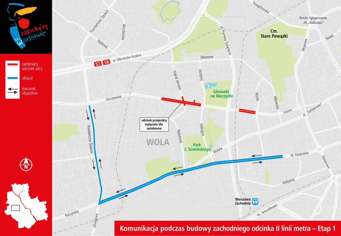 Zamknięta dla ruchu będzie ul. Górczewska pomiędzy al. Prymasa Tysiąclecia a Płocką (nie będzie również przejazdu przez ul. Górczewską ulicami Księcia Janusza, J. Olbrachta i Ciołka) oraz pomiędzy ul. Elekcyjną a wjazdem do centrum handlowego Wola Park. Ulica Płocka będzie nieprzejezdna na południe od skrzyżowania z ul. Wolską od wiosny 2017 r. W 2017 r. na kilka miesięcy zwężona zostanie ul. Wolska przy Płockiej, ul. Górczewska przy Parku Moczydło a także ul. M. Kasprzaka przy ul. Karolkowej i Rogalińskiej.