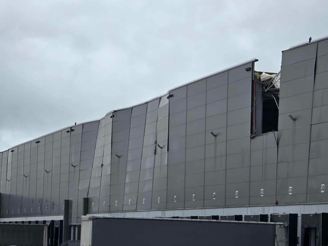W wyniku silnej wichury i burzy, która przechodzi właśnie nad Warszawą w miejscowości Chlebnia koło Grodziska Mazowieckiego wiatr zerwał dach z części wielkich magazynów logistycznych.