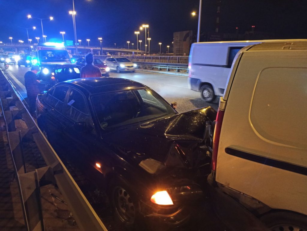 Na pasie tranzytowym na S8 na wysokości ulicy Jagiellońskiej w kierunku Marek doszło do zderzenia trzech aut i potrącenia kierowcy.