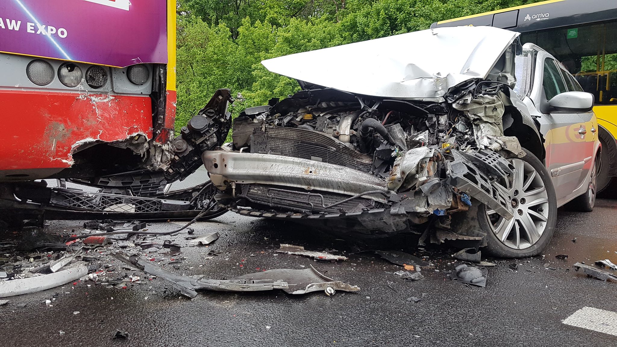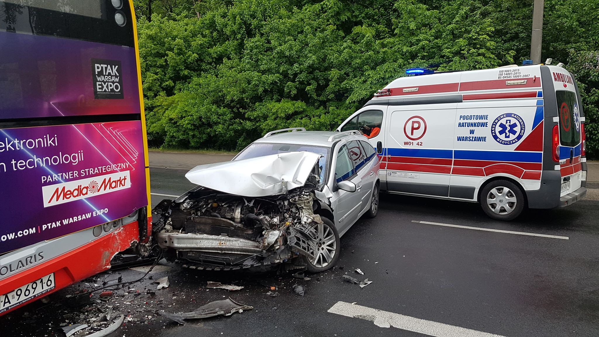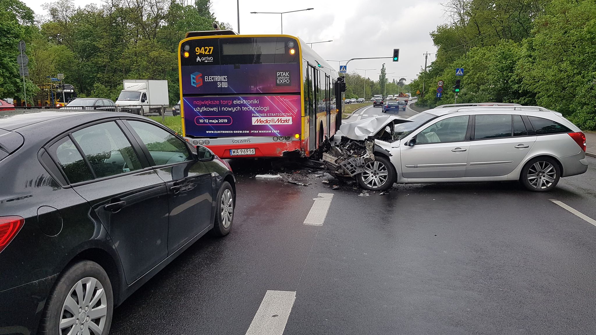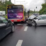 Zderzenie autobusu z dwoma samochodami osobowymi. Duże utrudnienia w ruchu