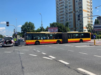 Zderzenie autobusu z samochodem osobowym na Gocławiu. Skrzyżowanie zablokowane
