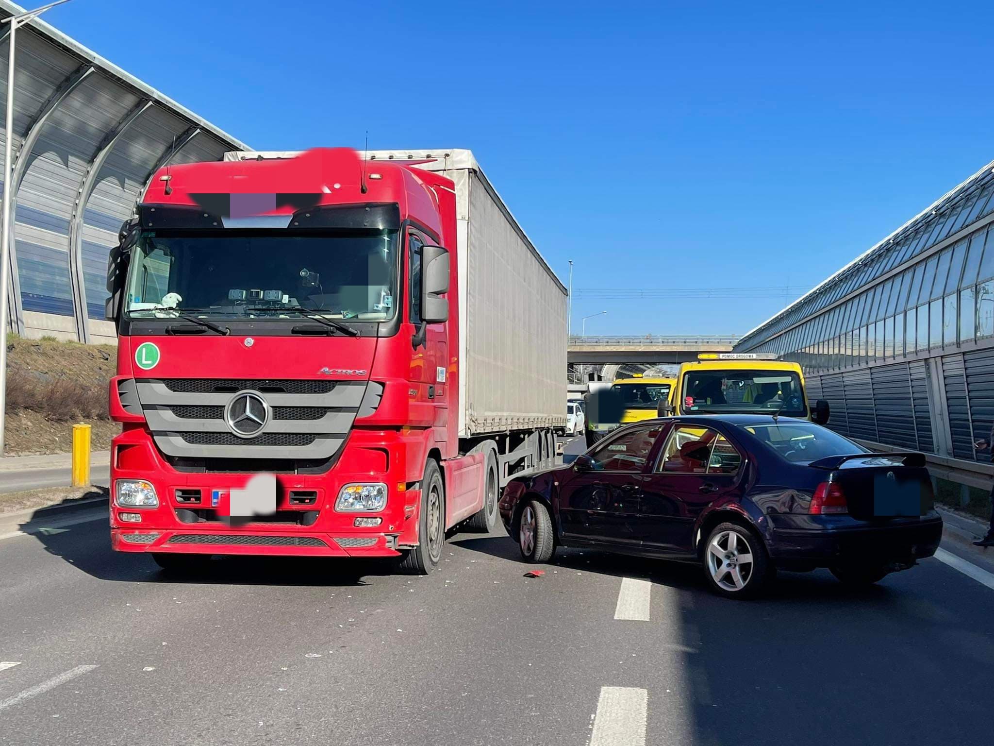 Na trasie S8 na pasach lokalnych pomiędzy Rembielińską a Marywilską w kierunku Poznania doszło do zderzenia ciężarówki z samochodem osobowym marki volkswagen. Auto stanęło w poprzek jezdni. Nikomu nic się nie stało.