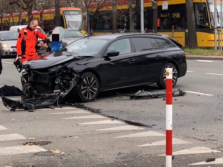 Na skrzyżowaniu Puławskiej z Malczewskiego doszło do zderzenia dwóch samochodów osobowych marki mazda i peugeot. Po zderzeniu jedno z aut wpadło w słup oraz betonowy śmietnik, który uderzył pieszego. Pieszy badany jest w karetce pogotowia.