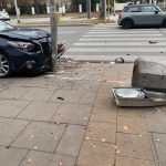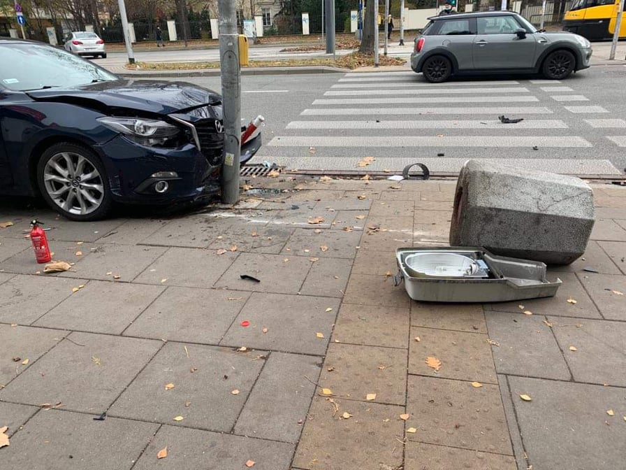 Zderzenie dwóch aut na Mokotowie. Betonowy śmietnik uderzył pieszego