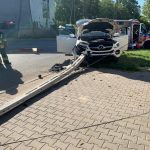 Po zderzeniu jeden z pojazdów wjechał w słup energetyczny, który przewrócił się na chodnik.