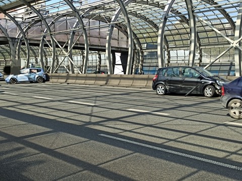 Jedno auto stoi w poprzek jezdni.