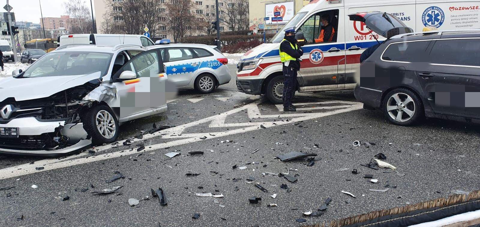 Na skrzyżowaniu Modzelewskiego z aleją Lotników na Mokotowie doszło do zderzenia dwóch taksówek marki renault i volkswagen. W wyniku zderzenia do szpitala trafiła jedna osoba.