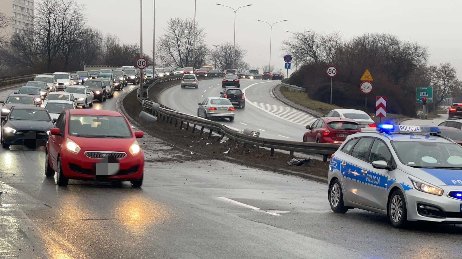 Na Wisłostradzie na wysokości Krasińskiego w kierunku centrum kierujący samochodem osobowym marki Infinity stracił panowanie nad autem i uderzył w barierki i latarnię. Latarnia spadła na przeciwny pas ruchu blokując jeden pas ruchu w kierunku Łomianek.